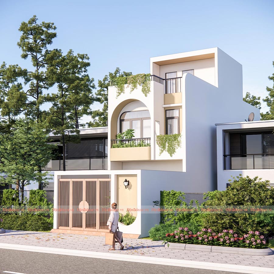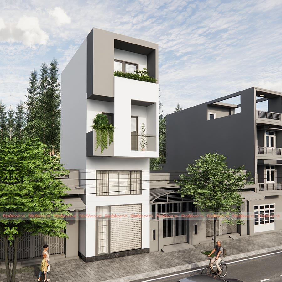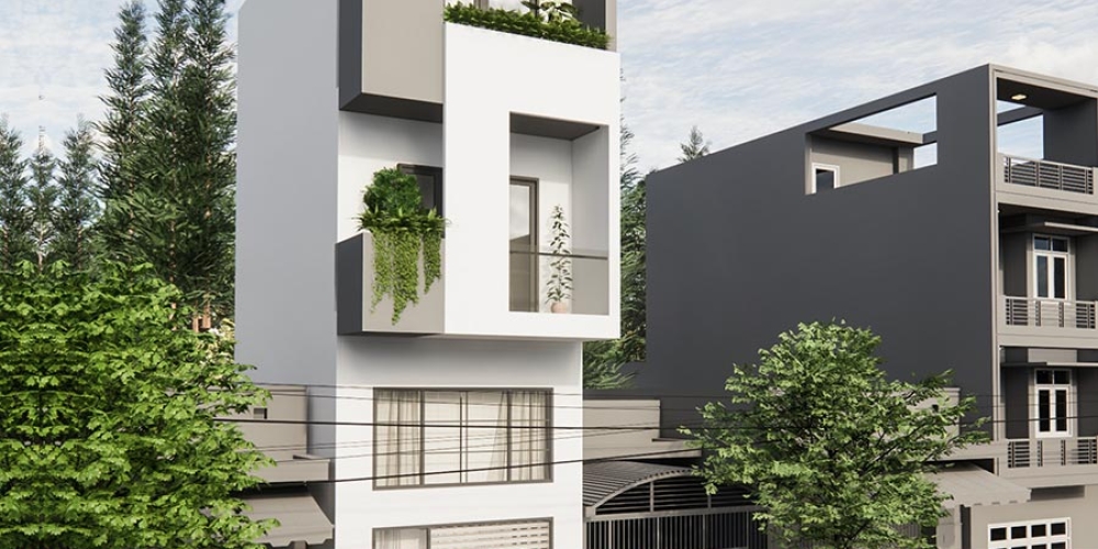 Ý tưởng thiết kế: Căn nhà được thiết kế đơn giản, thoáng đãng, tông màu trắng sáng, cửa sổ lớn để lấy trọn gió và ánh nắng tự nhiên, ban công được thiết kế khu trồng được cây xanh, tạo không gian xanh mát tự nhiên cho ngôi nhà.