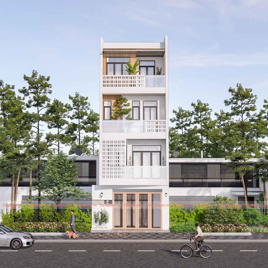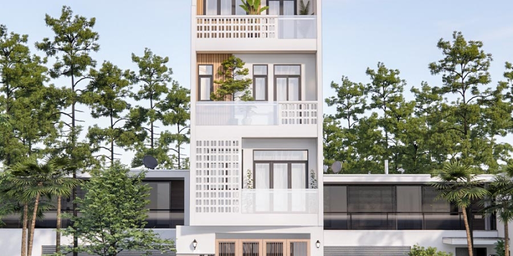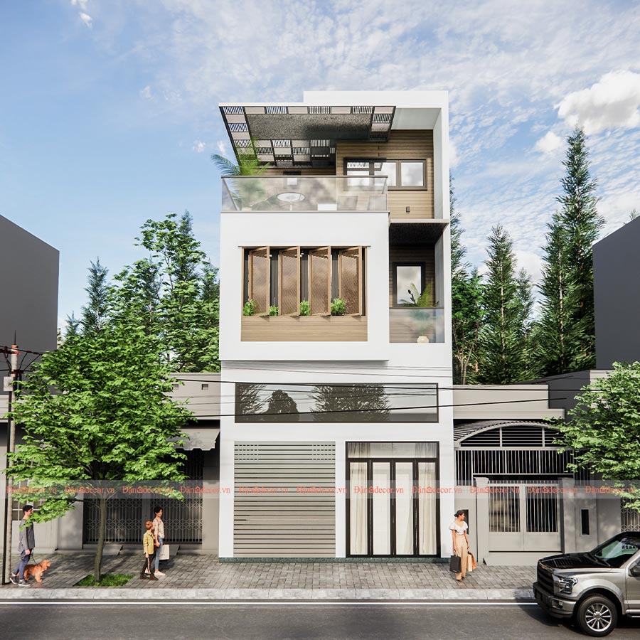 Ý tưởng thiết kế:  Anh Long, chủ nhà còn trẻ nên muốn xây nhà phố lấy tông màu trắng làm chủ đạo. Do nhà hướng Tây Nam nên buổi chiều sẽ bị một phần nắng chiếu vào. Vì vậy kiến trúc sư đã thiết kế một hệ lam dài màu gỗ tối chạy dọc hết lầu 1 ngôi nhà, vừa có tác dụng làm giảm bớt ánh nắng trực tiếp vừa tạo điểm nhấn độc đáo cho mặt tiền ngôi nhà.