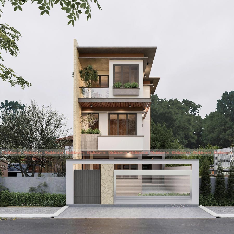 Mặt tiền sử dụng gam màu trung tính như trắng, be và xám, kết hợp hài hòa với: