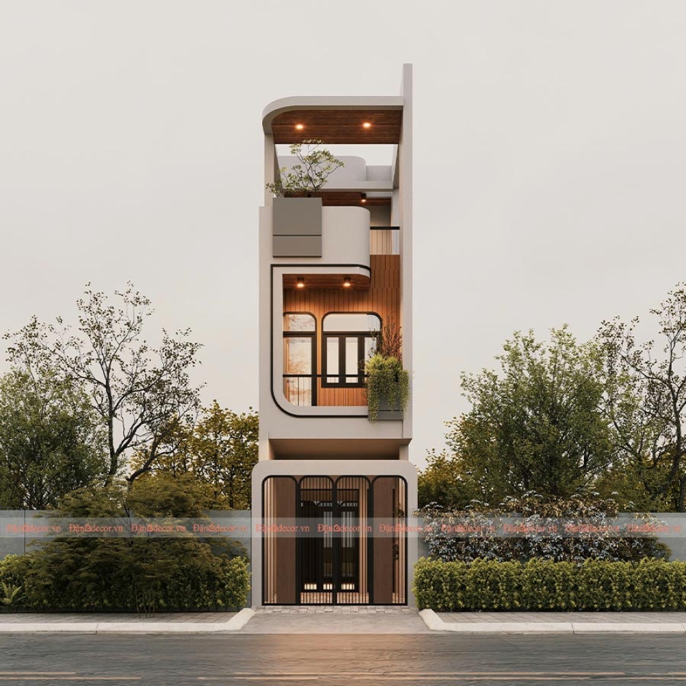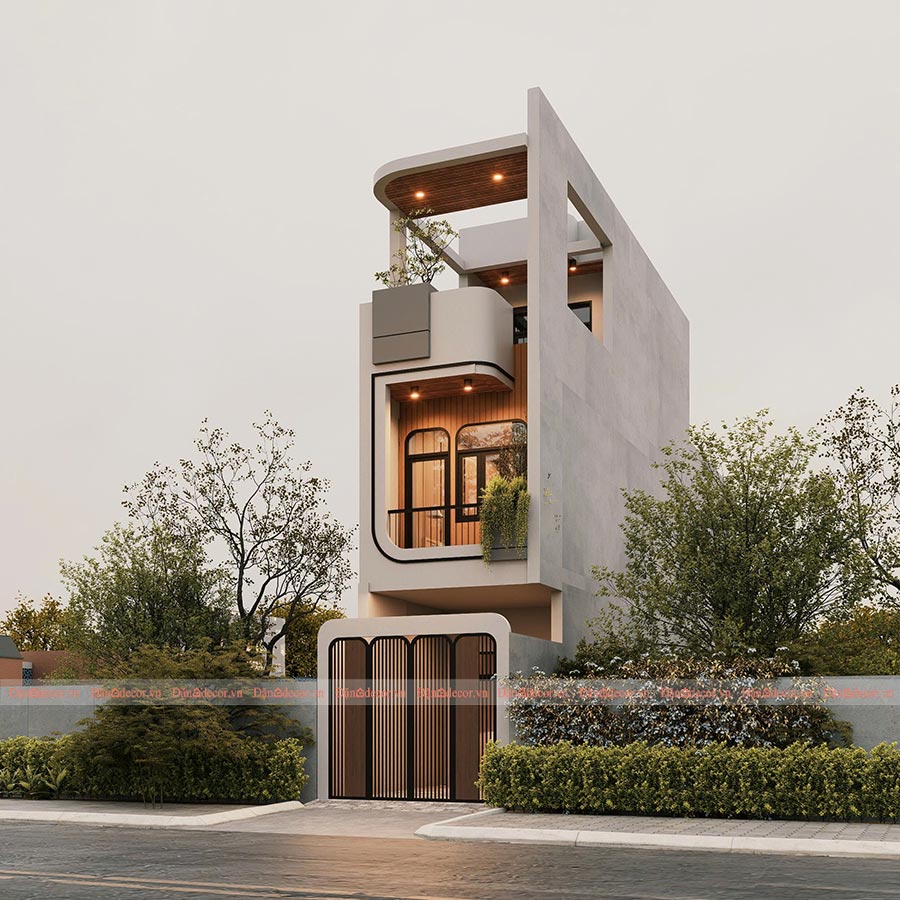 Điểm nhấn nổi bật của mẫu nhà phố 3 tầng mặt tiền hẹp này nằm ở thiết kế mặt tiền độc đáo. Kiến trúc sư đã sử dụng đường cong mềm mại ở khu vực ban công, giúp công trình trở nên thanh thoát và tạo cảm giác nhẹ nhàng hơn so với các khối nhà vuông truyền thống.