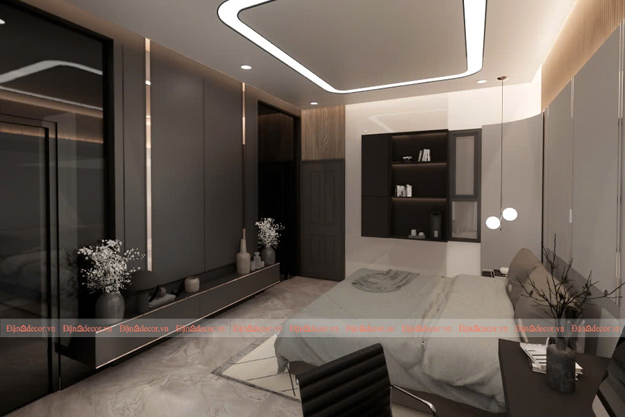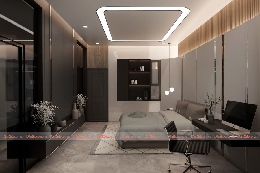 Đặng Decor đã khéo léo bố trí giường ngủ, bàn làm việc, tủ âm tường và kệ trang trí trong cùng một không gian nhưng vẫn đảm bảo sự thông thoáng.