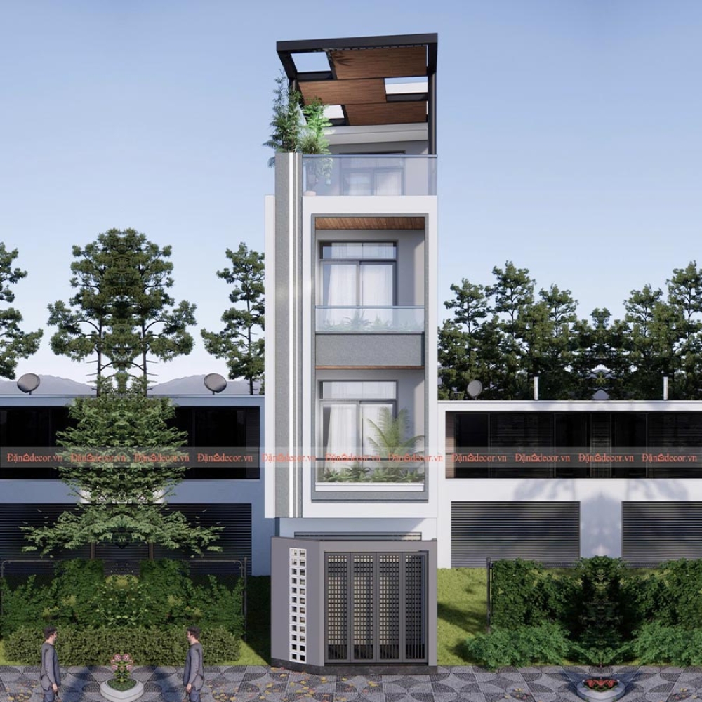 Mặt tiền tối giản nhưng sang trọng, sử dụng gam màu trắng tinh khôi làm chủ đạo, kết hợp các chi tiết màu xám và ốp gỗ, giúp công trình vừa hiện đại vừa có chiều sâu thẩm mỹ. Các đường nét vuông vức, mạnh mẽ nhưng vẫn hài hòa, tạo nên vẻ đẹp tinh tế và bền vững theo thời gian.
