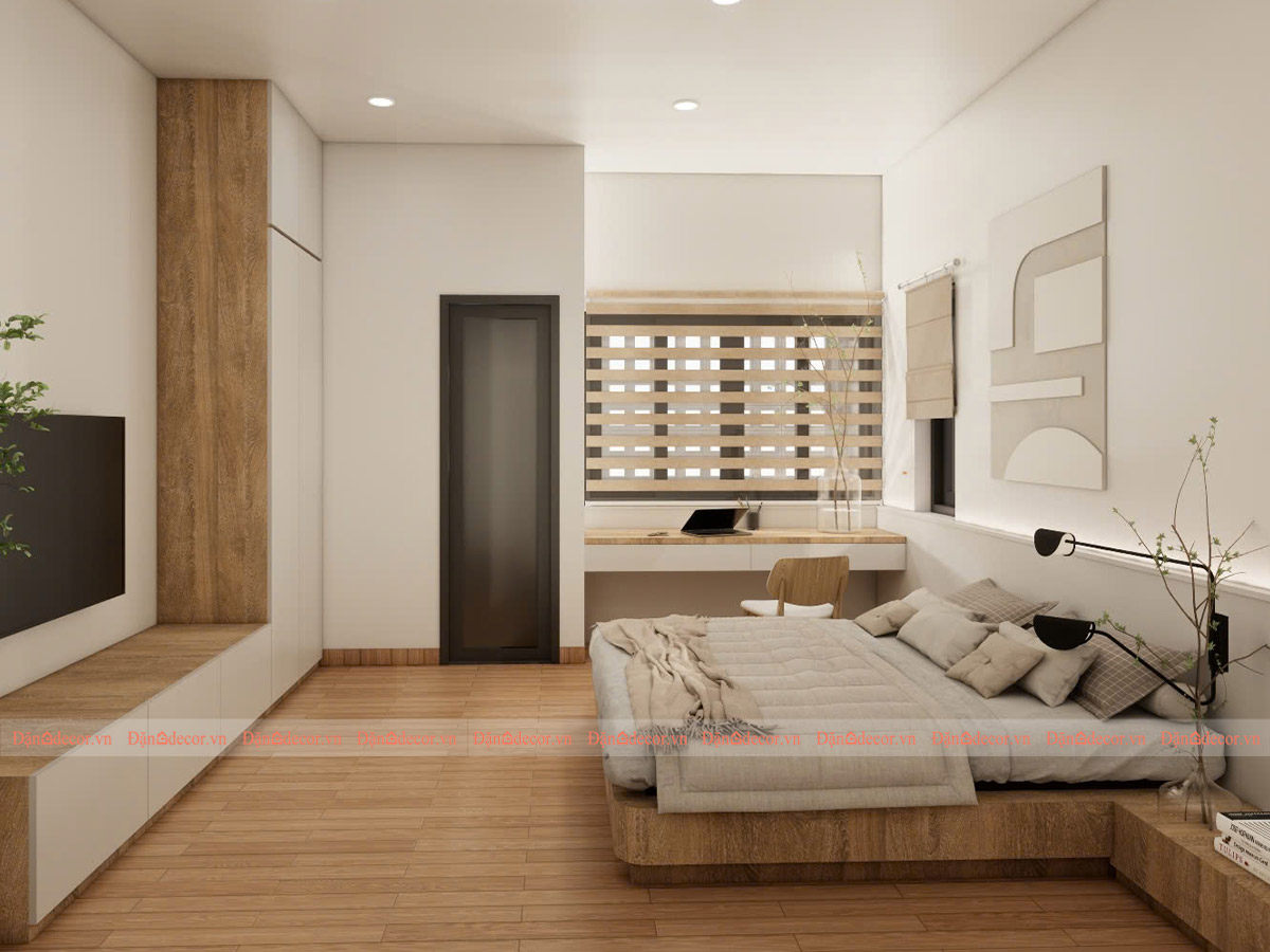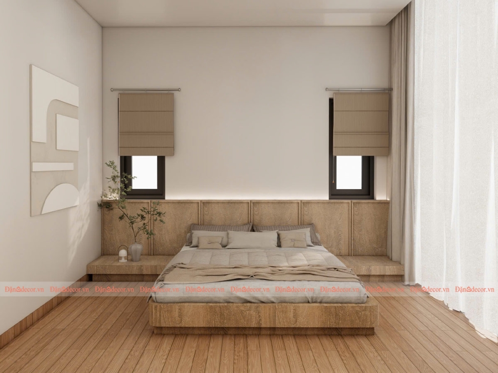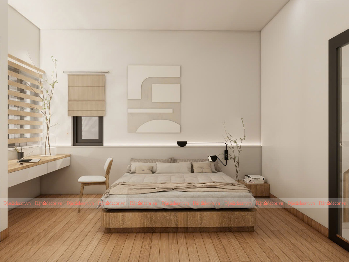Phòng ngủ được thiết kế theo phong cách Japandi, một xu hướng nội thất hiện đại được yêu thích trên toàn thế giới. Japandi là sự hòa quyện giữa tinh thần tối giản Nhật Bản (Japanese Minimalism) và nét ấm áp, hiện đại của Scandinavian.