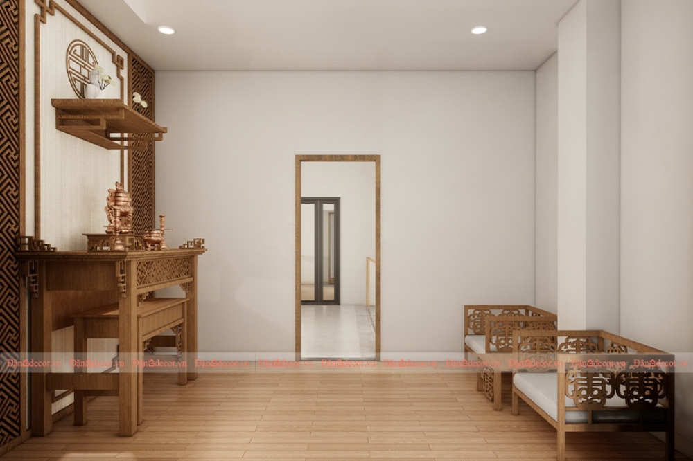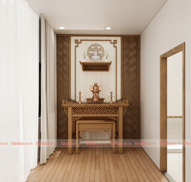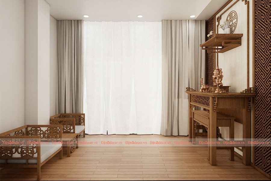 Rèm trắng lọc bớt ánh sáng tự nhiên, giúp phòng thờ không bị chói mà vẫn đủ sáng, tạo không gian yên bình – đúng tinh thần thờ tự của Á Đông.